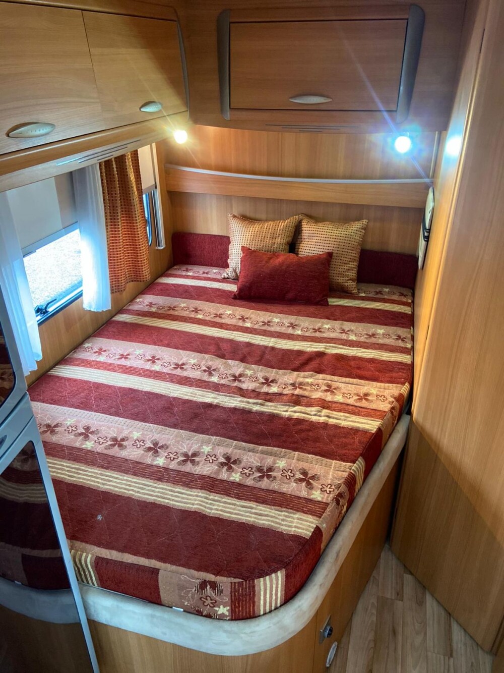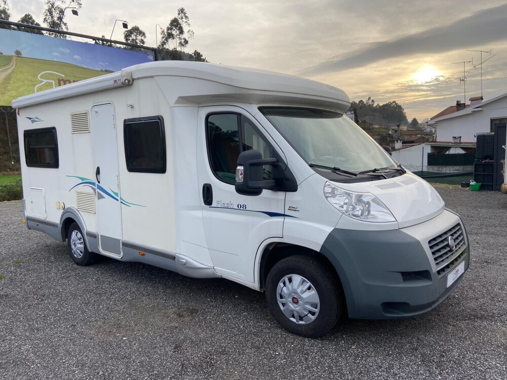 AUTOCARAVANA CHAUSSON FLASH 08 Caraterísticas Ano: 2009 Tipo: perfilada Marca: Chausson medidas: C: 6,65 m L: 2,25m A: 2,80m 4 lugares sentados, 4 lugares para dormir 1 cama francesa 130x190cm (sempre pronta) e 1 cama montável sobre a mesa Tv Frigorifico grande, congelador separado (gás,12v,220v) Fogão 3 queimadores Caldeira (boiler) de aquecimento e águas quentas a gás Casa de banho com sanita ( cassete) e lavatório Chuveiro separado Claraboia panorâmica 1 painel solar Suporte para 2 bicicletas Toldo Bancos da frente rotativo Compartimento para 2 garrafas de gás Cortinas Estores mosquiteiros em todas as janela Motorização Fiat Ducato 2,3 multijet, 130 cv Vidros elétricos Retrovisores elétricos Camara de recuo Ar condicionado (cabine) Rádio/cd Pneumáticos: 215/70R15 Bancos da frente com apoio de braços Revisão feita