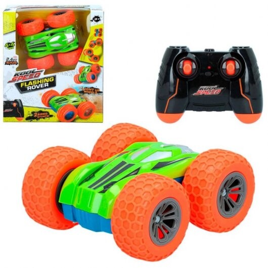 - Supera cualquier obstáculo con el coche radio control volteretas Kool Speed con luz y giro 360º, el coche tiene un lado color verde y otro color azul