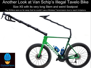 Another Look at Van Schip's Illegal Tavelo Bike Size XS with its very long Stem and weird Seatpost The Shifters were so far away that he couldn&...