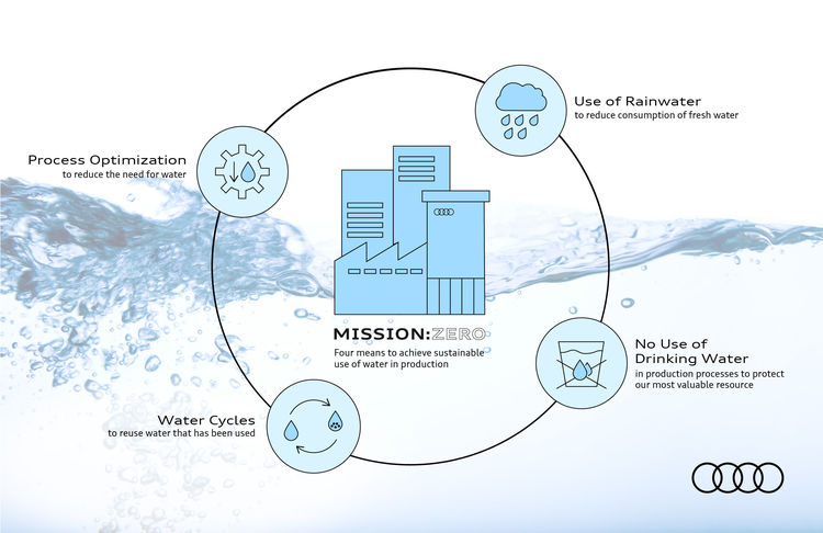 A água potável limpa é um dos recursos mais valiosos a nível mundial: É por isso que a Audi incluiu a utilização económica e eficiente da água como um aspecto chave do seu programa ambiental Mission:Zero. A empresa planeia manter o seu próprio consumo de água ao mínimo e deixar de utilizar água potável na produção de veículos no futuro. Para este fim, a Audi está a implementar eficientes processos e ciclos fechados de água, e a aumentar o uso de água da chuva. A longo prazo, a Audi planeia implementar ciclos fechados de água em todos os locais de produção.