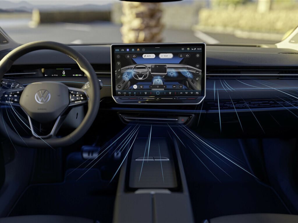 A função de controlo climático está localizada no nível operacional mais alto do novo visor do infotainment de 38 de centímetros (15 polegadas) do ID.7. O que significa que é sempre visível e pode ser ativada através de um simples toque. Usando o menu do ar condicionado, todas as saídas de ar inteligentes podem ser controladas digitalmente nas saídas. A força e a direção dos movimentos do ar podem ser ajustadas intuitivamente e guardadas individualmente. A temperatura pode ser controlada através de barras deslizantes tácteis retro iluminadas.