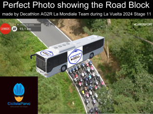 Perfect Photo showing the Road Block made by Decathlon AG2R La Mondiale Team during La Vuelta 2024 Stage 11